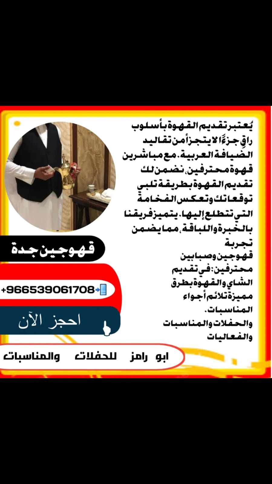 قهوجين ومباشرين جدة يتميز فريقن بي الخبرة والباقي والبس الموحد منسق حفلات ومناسبات وفعاليات اسم صاحب الأعلان: قهوجين ومباشرين
