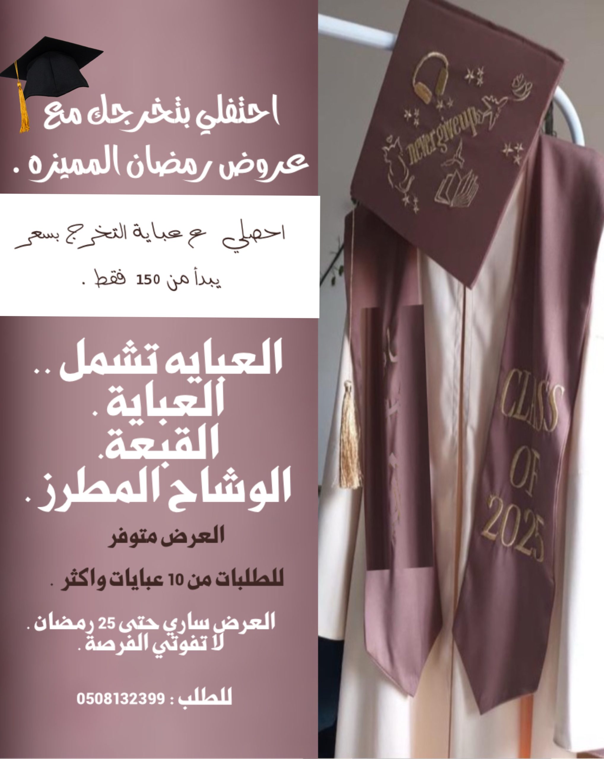 عروض رمضان تفصيل عبايات تخرج ب 150 ريال لاكثر من 10 طلبات لحد 25 رمضان .ع رقم 0508132399 اسم صاحب
