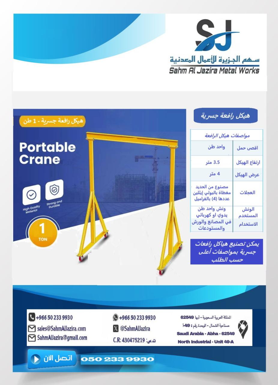 للبيع رافعة جسرية متحركة جديدة (مع الونش وبدون) مصممة لرفع واحد طن كحد اقصى ارتفاع 3.5 متر وعرض 4 متر