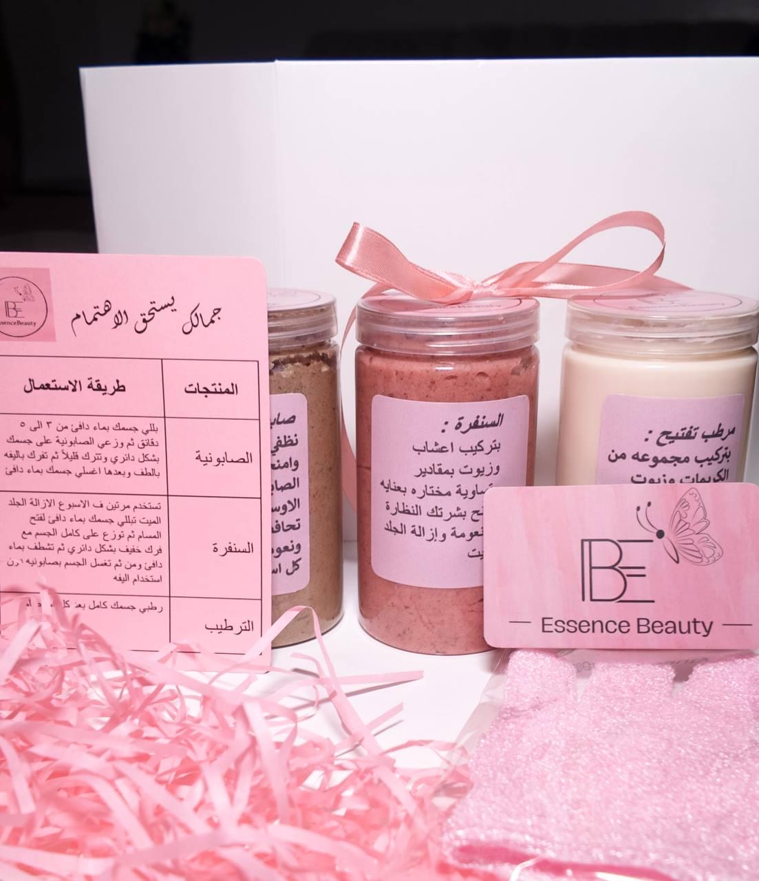 رابط المتجر على سله : https://salla.sa/essencebeauty محتويات البكج : -صابونيه -سنفره -ترطيب -ليفة -طريقة استعمال البكج خصائص المنتجات : •آمنة