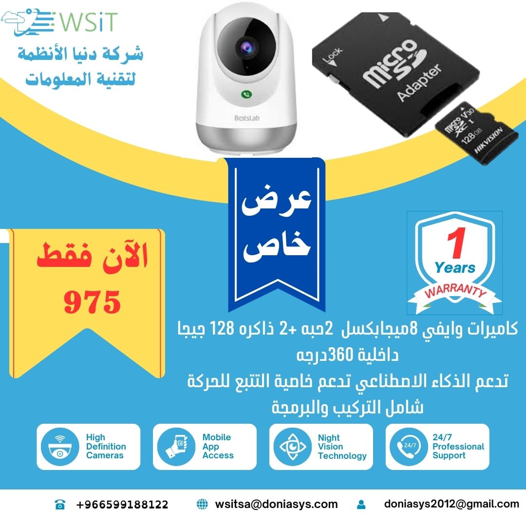 كاميرات وايفي 2حبة +ذاكرة 128 جيجا 2حبة تدعم الذكاء الاصطناعي وتدعم خاصية التتبع اسم صاحب الأعلان: شركة دنيا الأنظمة لتقنية