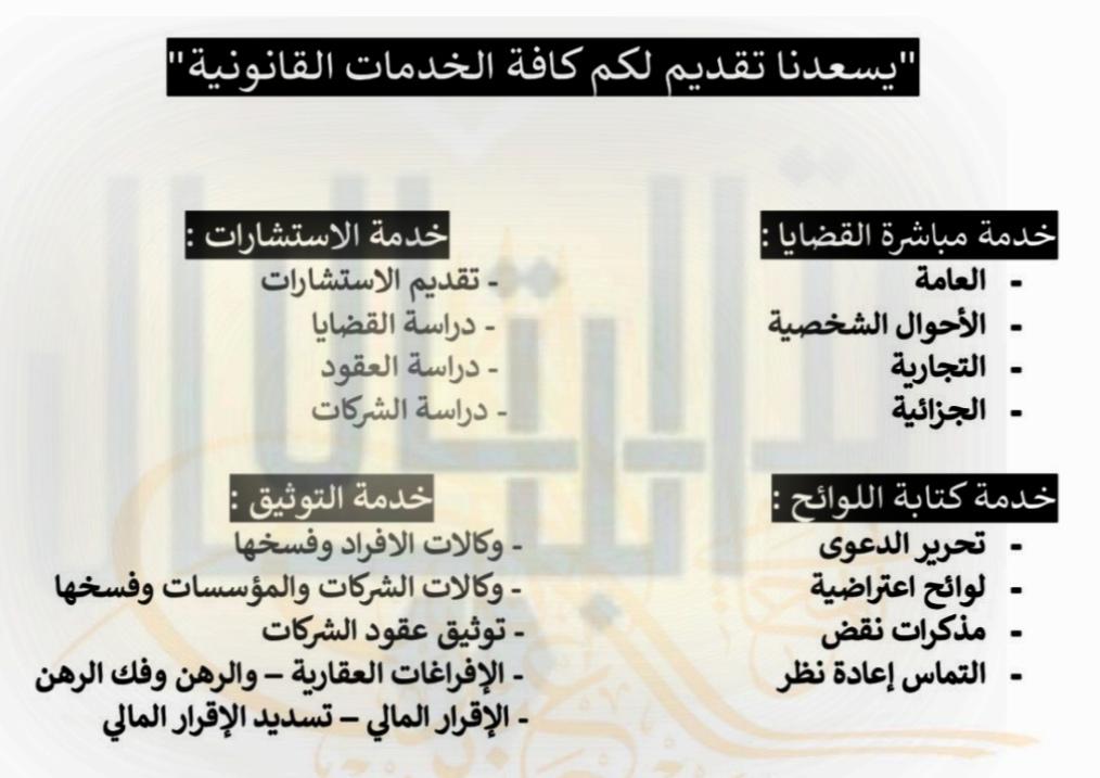 يسر مكتبنا أن يقدم لسيادتكم استشارات قانونية شفهية مجانية كجزء من جهودنا التعاونية، وذلك لتوفير الدعم القانوني الوقائي. كما يعد