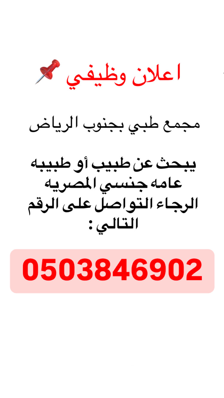 إعلان وظيفي مجمع طبي بجنوب الرياض مطلوب طبيب أو طبيبه عامه مصري الجنسيه الرجاء التواصل على الرقم التالي 0503846902 اسم