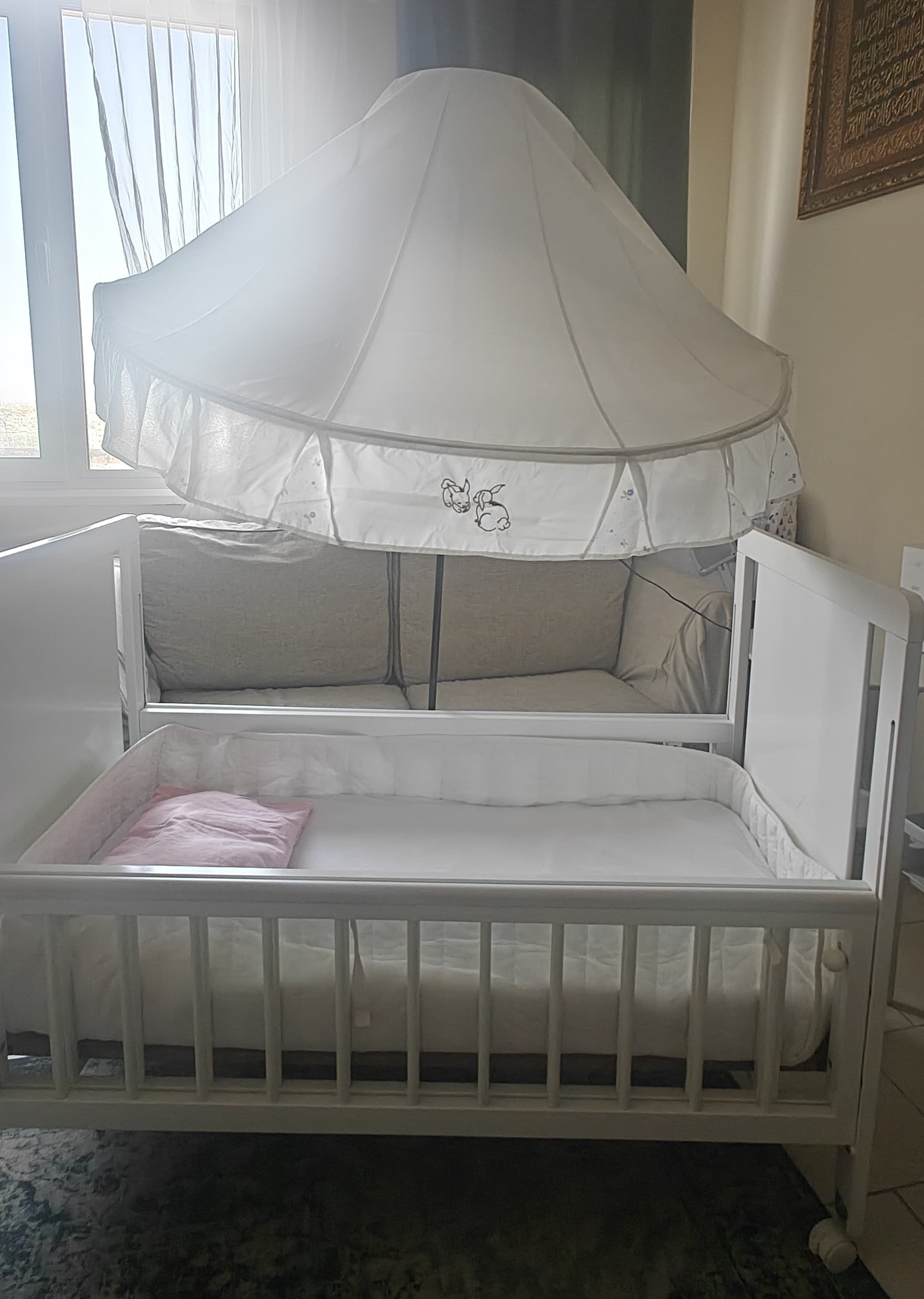 الحالة: ممتازة جدًا اللون: أبيض المقاس: 120×65 سم مميزات إضافية: قضبان متحركة للحماية 4 عجلات دوارة 360 درجة مع فرامل