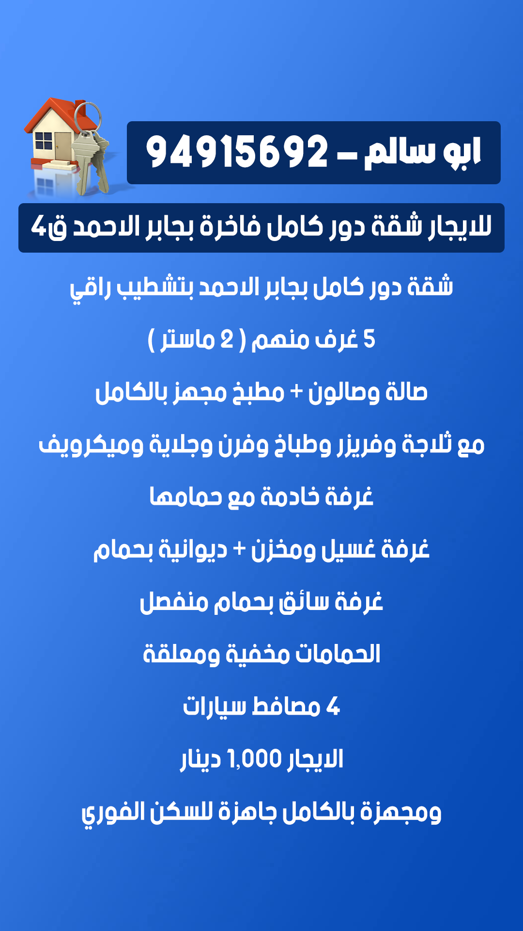 شقة دور كامل بجابر الاحمد بتشطيب راقي 5 غرف منهم ( 2 ماستر ) صالة وصالون + مطبخ مجهز بالكامل