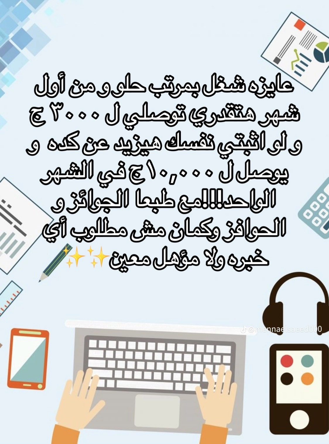 السلام عليكم متاح معايا شغل اونلاين من البيت للشباب و البنات و لو حابب تنزل شغل على الواقع متاح برضو